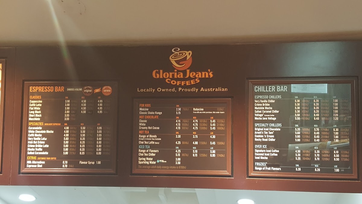 Introducing the menu at Gloria Jean's Sydney Central Plaza, a delightful coffee shop nestled in the heart of Sydney's bustling food court. The menu is a feast for coffee enthusiasts, featuring an impressive array of hot and cold beverages. Customers rave about the Caramelatte and matcha latte, although it's worth noting that the matcha can occasionally run out.